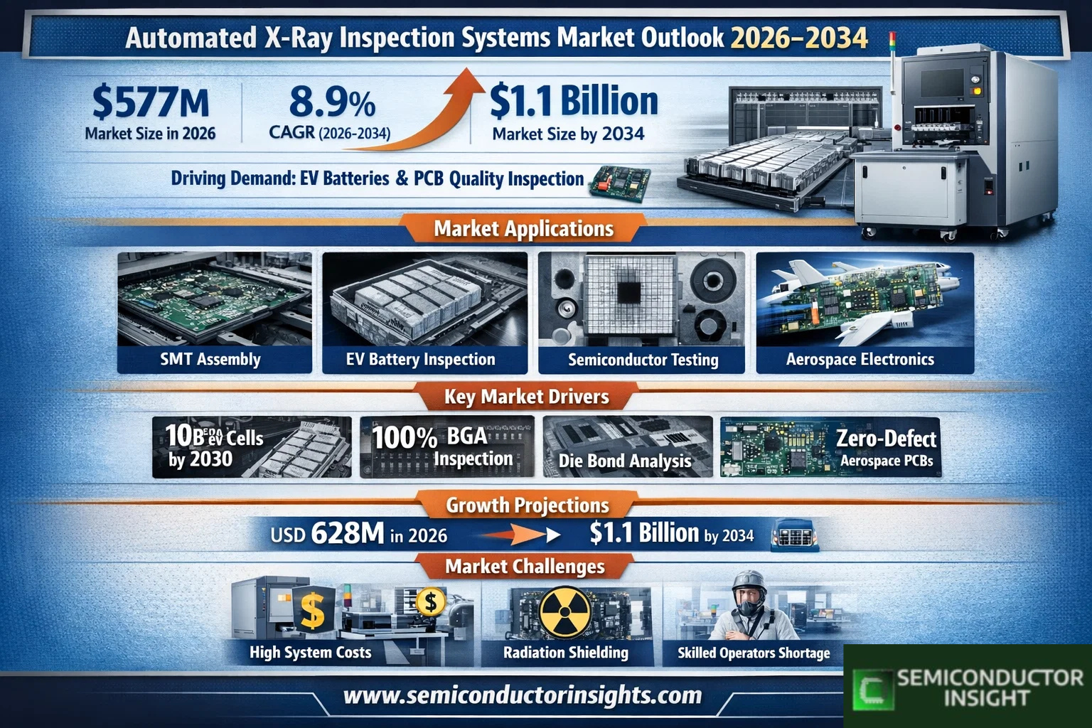 Global Automated X-ray Inspection Systems Market size was valued at USD 577 million in 2026. The market is projected to grow from USD 628 million in 2026 to USD 1100 million by 2034, exhibiting a CAGR of 8.9% during the forecast period (2026-2034). This expansion tracks rising non-destructive testing needs in high-volume electronics assembly.
