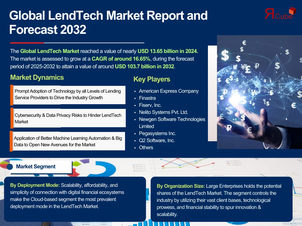 The Report Cube which is one of the leading market research company in UAE expects the LendTech Market to grow at a CAGR of around 16.65% through 2032, as highlighted in their latest research report. The study provides an in-depth analysis of the emerging trends shaping the LendTech Market and offers detailed forecasts for its potential growth during 2025–2032. The report also presents a comprehensive assessment of the competitive landscape, including profiles of leading players, their performance metrics, and recent strategic developments. Additionally, it explores the key market drivers, challenges, opportunities, and provides insights into historical and future revenue trends at the global, regional, and country levels.