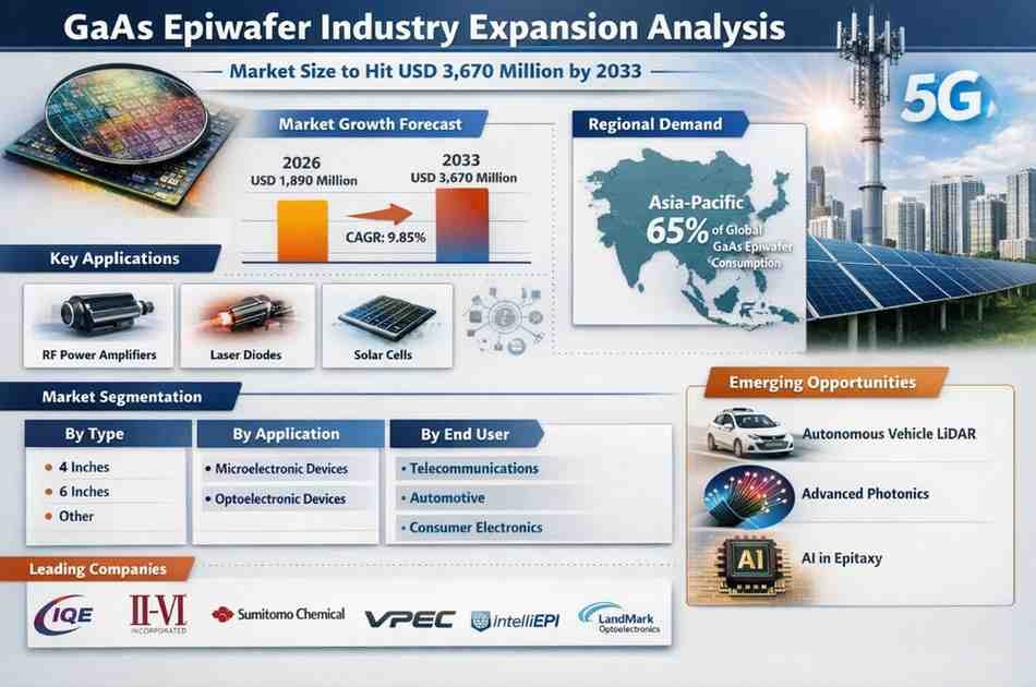 GaAs Epiwafer Market, valued at a robust USD 1,890 million in 2026, is on a trajectory of significant expansion, projected to reach USD 3,670 million by 2033. This growth, representing a compound annual growth rate (CAGR) of 9.85%, is detailed in a comprehensive new report published by Semiconductor Insight. The study highlights the critical role of these specialized semiconductor substrates in enabling high-frequency and optoelectronic applications across telecommunications, automotive, and consumer electronics sectors.