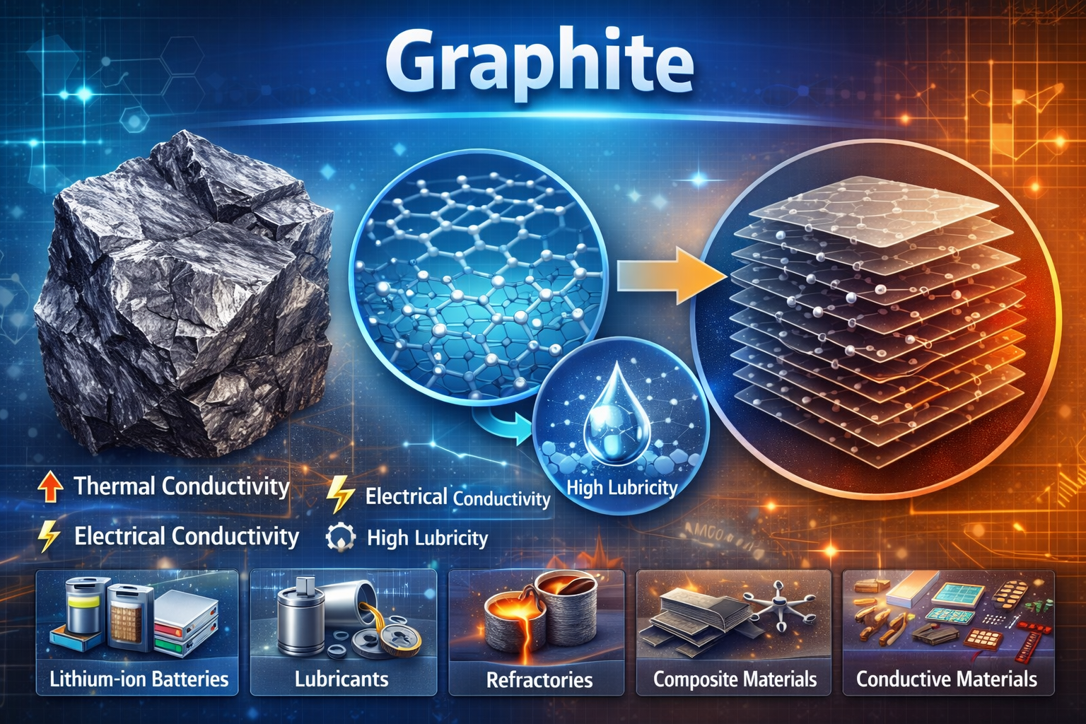 Graphite consists of carbon atoms arranged in a hexagonal lattice structure. The atoms are bonded strongly within layers but weakly between layers. This layered structure allows the sheets to slide over one another easily, giving graphite its softness and lubricating ability. Because of free moving electrons within its layers, graphite is also a good conductor of electricity..