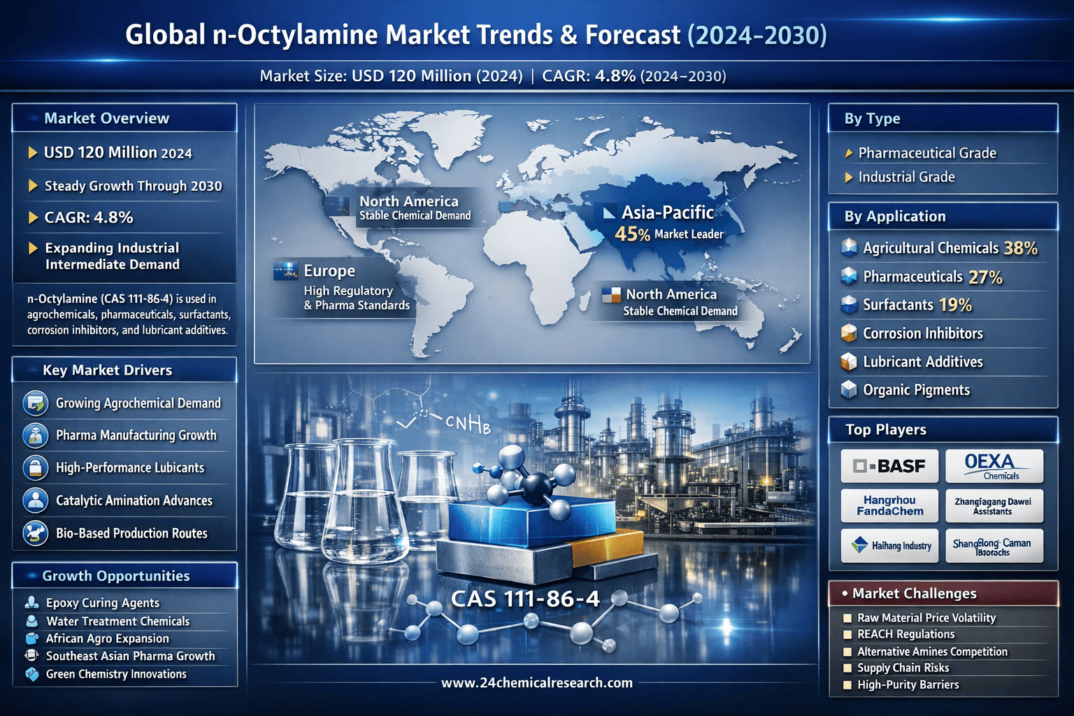 According to 24Chemical Research, Global n-Octylamine market demonstrates steady expansion, with its valuation reaching USD 120 million in 2024. According to latest industry projections, the market is poised to grow at a CAGR of 4.8% during 2024-2030,