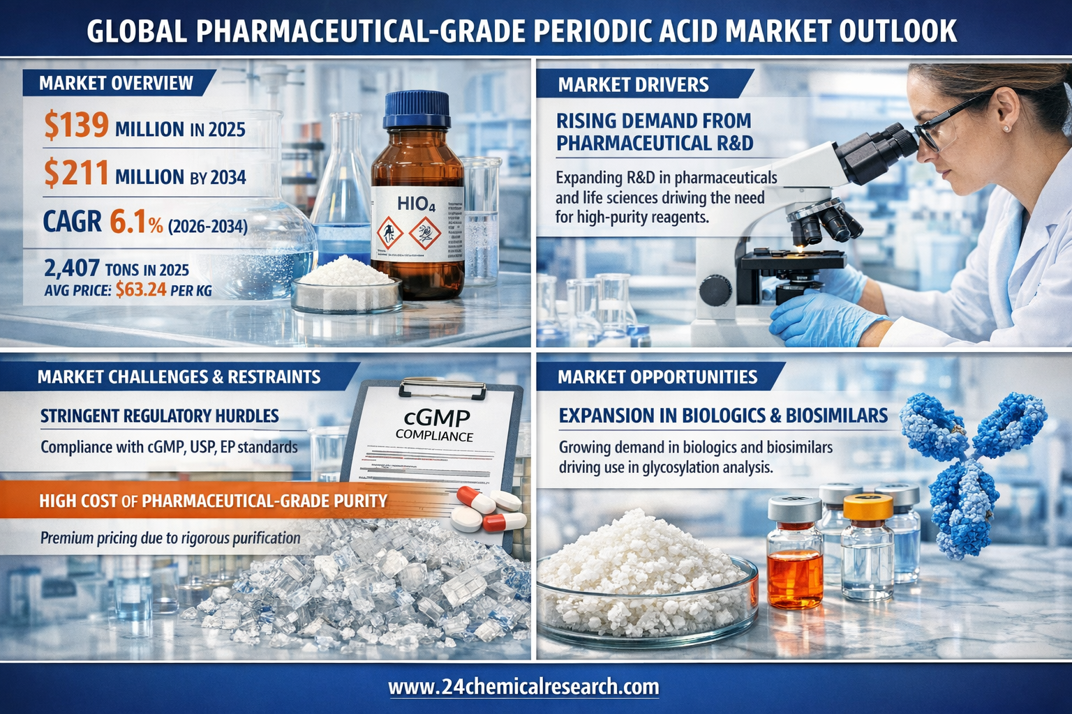 What's driving Global Pharma-grade Periodic Acid to USD 211 M API synthesis needs? Global Pharmaceutical-grade Periodic Acid Market was valued at USD 139 million in 2025. The market is projected to grow from USD 148 million in 2026 to USD 211 million by 2034, exhibiting a CAGR of 6.1% during the forecast period. In terms of volume, sales reached 2,407 tons in 2025, with an average price of USD 63.24 per kilogram. Download FREE Sample Report: https://www.24chemicalresearch.com/download-sample/300285/pharmaceuticalgrade-periodic-acid-marketWhat's driving Global Pharma-grade Periodic Acid to USD 211 M API synthesis needs?