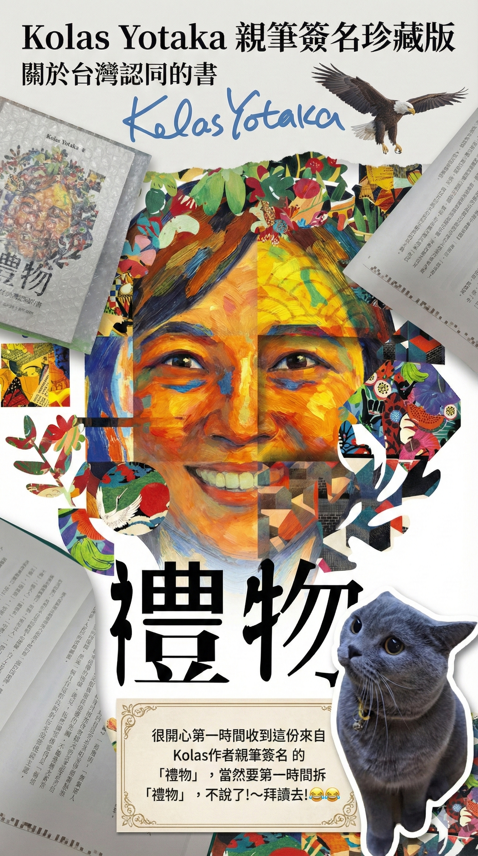 一份獻給台灣,也獻給自我的珍貴《禮物》 很開心第一時間收到這份來自 Kolas Yotaka 作者親筆簽名的《禮物》!🎁 光是看到封面上色彩斑斕的拼貼意象,和那句「台灣認同,是送給世界的禮物」,就讓人感受到一股堅定而溫柔的力量。當然要第一時間拆開這份「禮物」,不說了!拜讀去!😂😂 📖 為什麼推薦這本書? 這不只是一本回憶錄,更是一場關於「我是誰」的深刻思辨。 誠如書中所言:「認識自己的過程,不是白白得來。」Kolas 用她的筆觸,寫下了在錯亂的身分認同暴力下,我們是如何掙扎、又是如何做出選擇。 從米蘭昆德拉筆下的中歐悲劇,對照到台灣與中國的角力,書中探討的「認同」不再是非黑即白的單選題,而是複雜且有機的結合。無論是「台灣人」、「原住民」、「講美式英語的女人」或是「講台語的孫女」,這些都是我們,不需要遭受道德的批判。 🦅 逆風飛翔的勇氣 特別喜歡封底的那段話: 「我看見一隻老鷹不斷盤旋... 原來老鷹會鎖定一個看不見的圓心乘風而起。」 台灣的處境就像那隻逆風的鷹,或許艱難,但我們始終在尋找上升氣流,堅定地往目標飛去。 這本書,推薦給每一位在這塊土地上生活、思考著未來的你。讓我們一起打開這份禮物,重新認識那個堅韌的自己。 🐱 後記: 連家裡的貓貓都對這本書充滿好奇,湊過來一起開箱(其實是想搶鏡頭?😆)。好書配萌寵,今晚的閱讀時光太完美了! #KolasYotaka #禮物 #台灣認同 #好書推薦 #親筆簽名版一份獻給台灣,也獻給自我的珍貴《禮物》