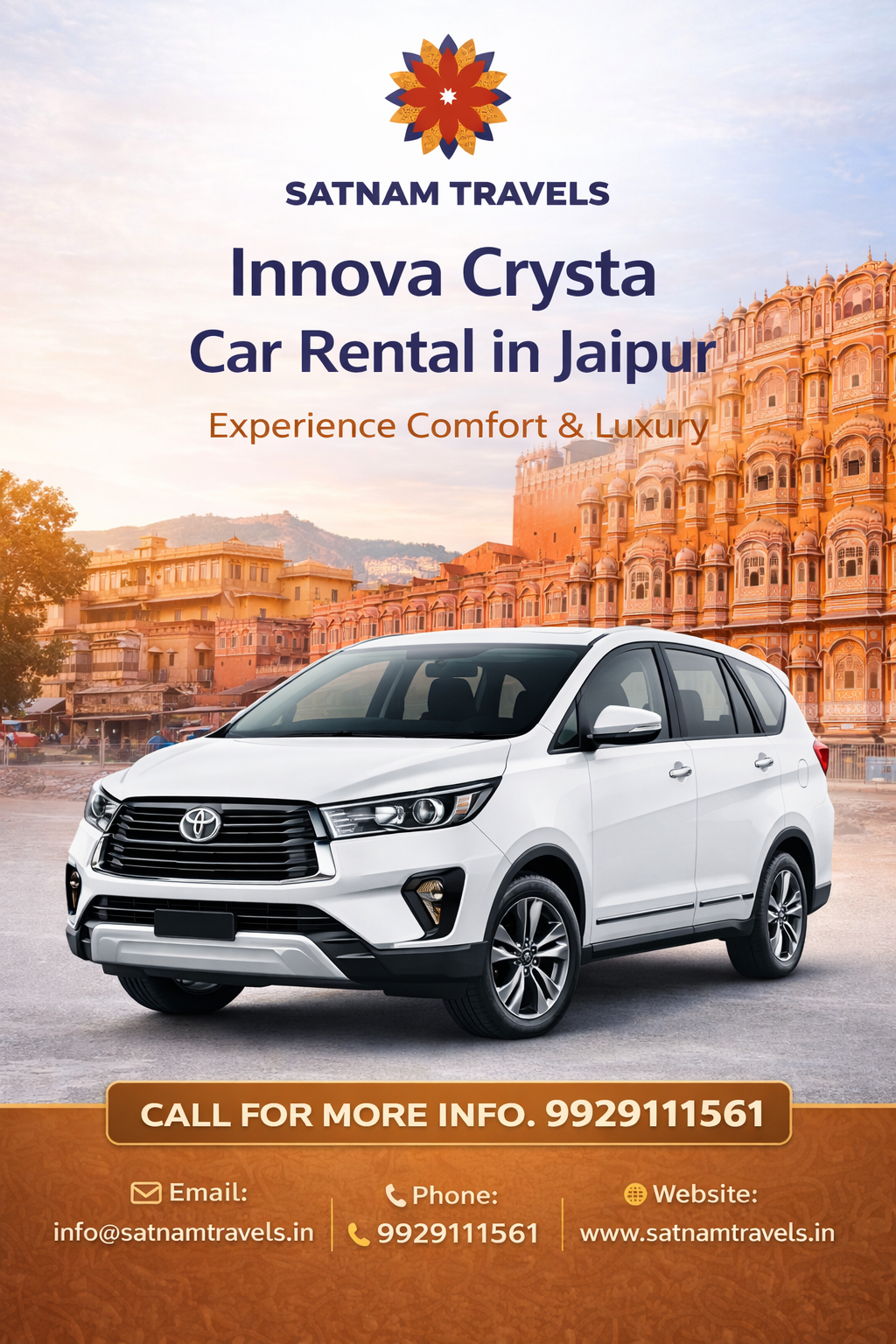Innova Crysta Car Hire in Jaipur for Comfortable Travel Visit: https://satnamtravels.in/innova-crysta-car.php Looking for a reliable Innova Crysta car hire in Jaipur for family trips, business tours, or airport transfers? Enjoy spacious seating, smooth rides, and professional chauffeur service for a hassle-free journey. Innova Crysta rental in Jaipur is perfect for local sightseeing and outstation travel. Book your premium ride today with Satnam Travels and experience comfort, safety, and timely service tailored to your travel needs across Jaipur and nearby destinations.Innova Crysta Car Hire in Jaipur for Comfortable Travel
