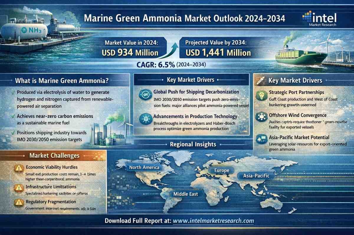 Intel Market Research, the global Marine Green Ammonia market was valued at USD 934 million in 2024 and is projected to reach USD 1,441 million by 2034, growing at a CAGR of 6.5% during the forecast period. This growth trajectory reflects the maritime industry's urgent decarbonization efforts and the shifting focus toward sustainable fuel alternatives.
