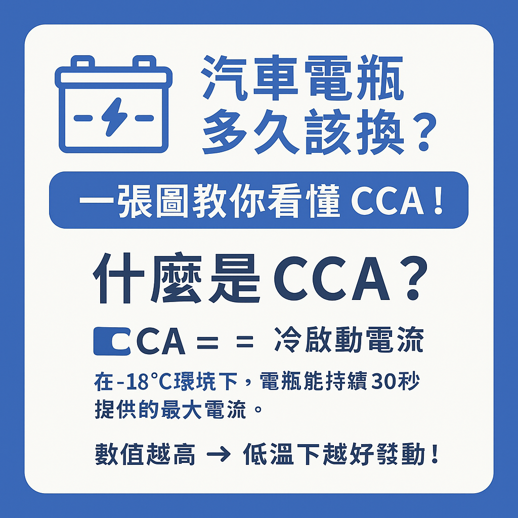 CCA代表冷啟動電流,是指電瓶在0°F (-18°C) 的低溫環境下,連續30秒能提供的最大電流,且電壓維持在7.2V以上。