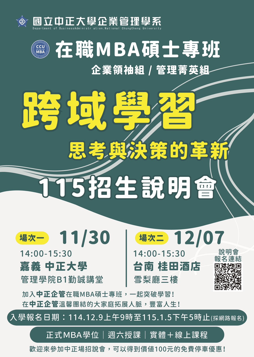 數位轉型時代,想轉換跑道,卻擔心知識能力,無法找到理想工作嗎? 在職已久,想向上發展,卻發現卡在學歷,無法順利加薪升遷嗎? 資源有限,想拓展人脈,卻驚覺方法用盡,無法尋覓您的伯樂嗎? 您的心聲,我們聽到了! 您的問題,我們幫您解決! 國立中正大學其以實務企業管理教學著稱的企業管理學系,自114年12月9日起至115年1月5日止,開始今年度在職MBA碩士專班報名,為讓各企業菁英瞭解在職MBA碩士專班的教 學方式與課程,於11/30(嘉義場)、12/7(台南場)舉行招生說明會。 中正企管系在職MBA堅持授予在職進修學員們正統MBA學位,事實上,在職經理人重返校園,可以好好把握對於跨領域學習思考與決策的革新。企業人士增加業界同學跨界人脈當然是必須的,但往更高主管層級的學員,除了需要專業與人脈,更需要與時俱進的管理知識與決策能力。 中正企管有最完整最新的企業管理課程設計,從策略決策、市場行銷、人資管理、人工智慧、大數據資管、財務分析等等課程讓同學們自由選修,配合每位來自不同業界的在職人員的需要,目前施行的「哈佛個案教學」、「超級CEO趨勢論壇」及「海外企業參訪」,都讓學員不虛此學。 年年好評,年年爆滿,來中正,讓你重溫青春時代的校園生活!! 不論您是求知,或是求才,來中正,我們保證絕對不讓您失望!! 詳情可搜尋中正企管碩專班粉絲團,洽詢電話:(05)272-0563,何小姐。 臉書FB搜尋:中正企管碩專班https://www.facebook.com/joinccu 招生說明會報名網址:https://reurl.cc/kojv53 招生小遊戲:https://reurl.cc/6qp6Nd 嘉義場:11/30(日)14:00-15:30 國立中正大學管理學院B1勤誠講堂 臺南場:12/07(日)14:00-15:30 臺南桂田酒店三樓雪梨廳